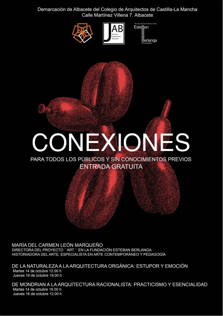 JAB, el grupo de Jóvenes Arquitectos de Albacete, de la Demarcación de Albacete del COACM, en colaboración con la Fundación Esteban Berlanga, se complace en invitaros a las charlas culturales «CONEXIONES», a cargo de María del Carmen León, que se celebrarán los próximos martes 14 y jueves 16 de octubre, a las 12:00 y 19:00 horas en el salón de actos de la Demarcación.