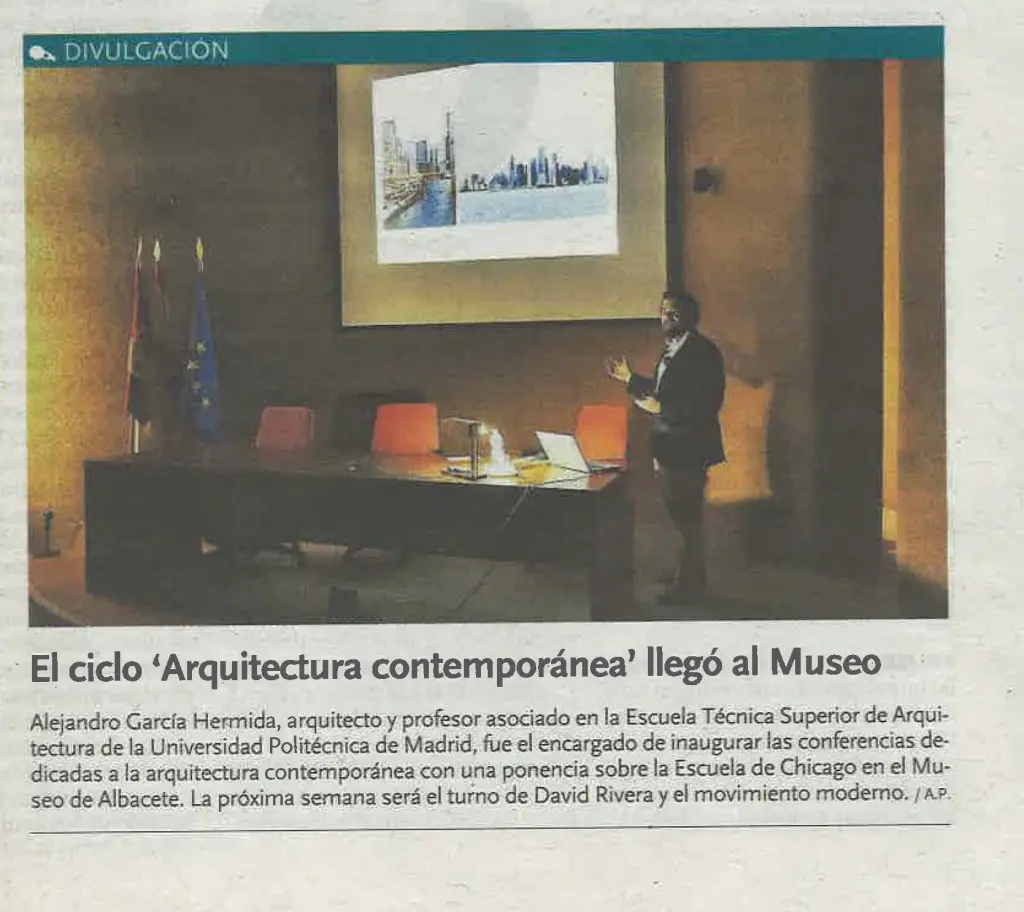 El pasado 8 de abril, tuvo lugar la primera conferencia del ciclo «Arquitectura Contemporáneas», impartida por por Alejandro García Hermida, titulada «Escuela de Chicago».