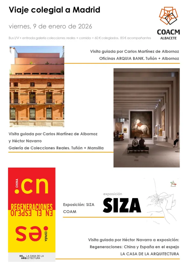 Tenemos el placer de convocar el viaje colegial a Madrid, que ha organizado la Junta Directiva del COACM AB dentro de los actos de un “otoño en torno a la Arquitectura”, programado con motivo de la Celebración del día Mundial de La Arquitectura. El viaje tendrá lugar el viernes 9 de enero, con el siguiente programa: